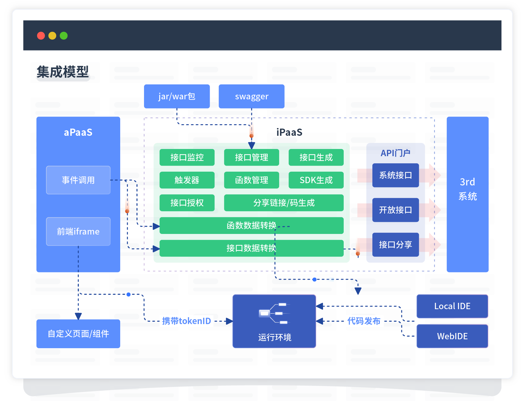 集成模型包括平台本身前、、、、、、后端能力的扩展,,,,,,,,,也支持通过API门户和第三方系统进行交互。。。。。。。。。。