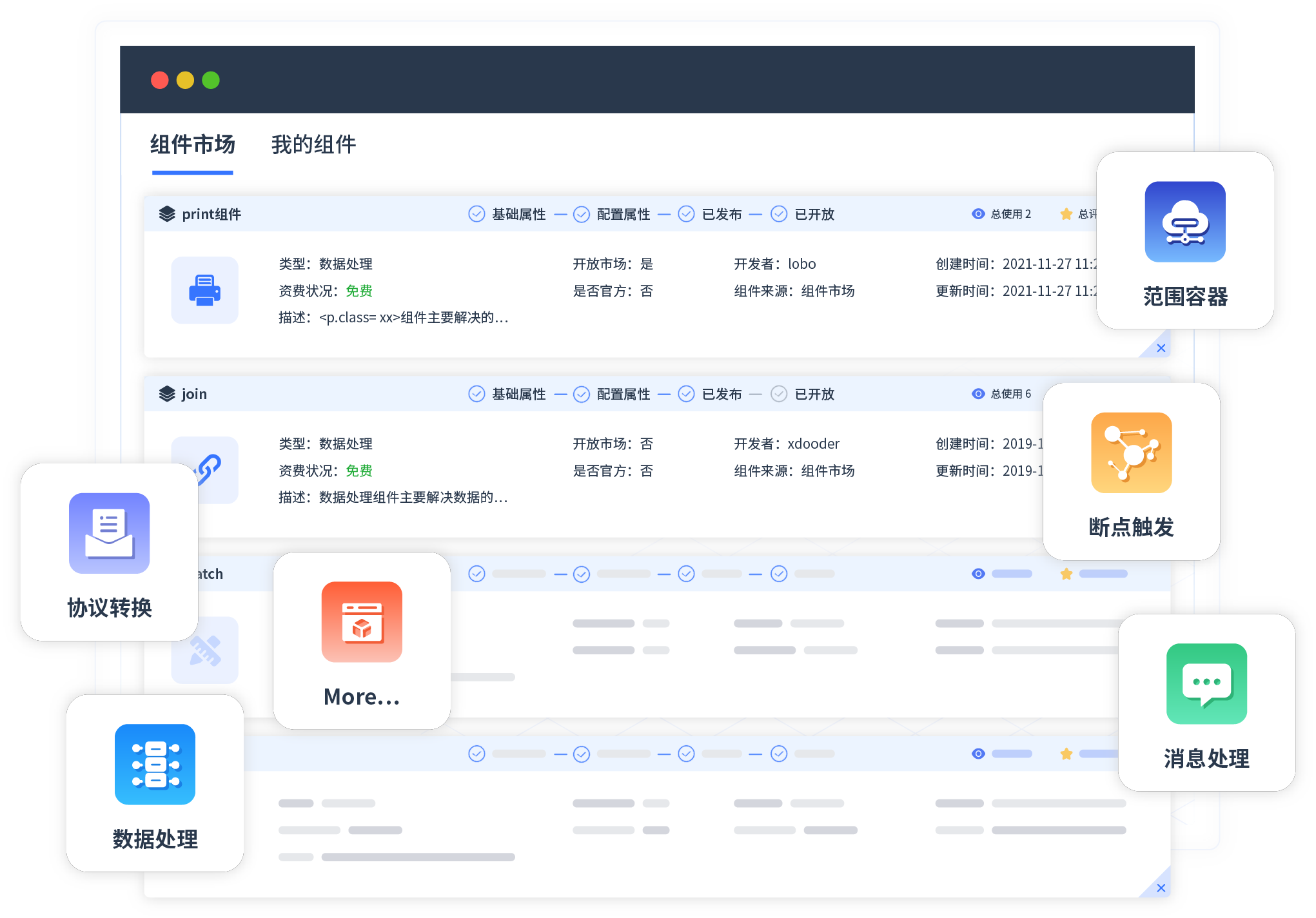 针对集成场景,,,,,,,,,OPPO钱包提供组件市场,,,,,,,,,,例如协议转换、、、、、、、、、、消息处理、、、、、、、、、文件操作等。。。。。。。。。。除平台提供的组件外,,,,,,,,,,客户可以自定义所需组件。。。。。。。