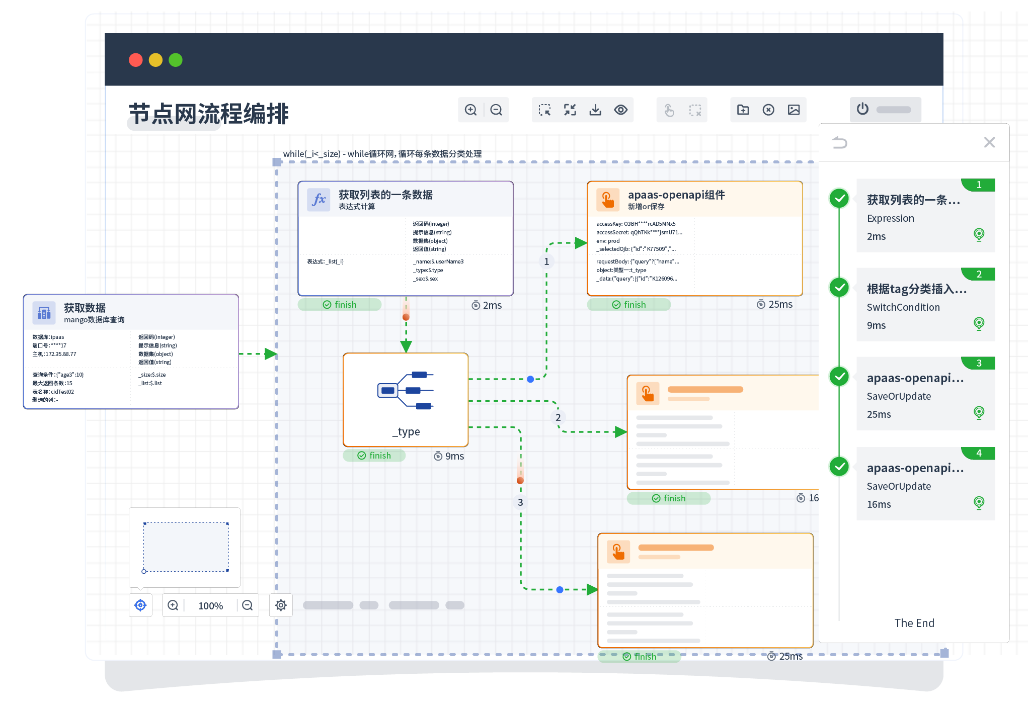 针对集成场景,,,,,,组件定义后支持进行流程编制,,,,,,,,,,不同于传统代码方式,,,,,,通过图形化展示,,,,,,支持在线调试、、、、、、、、、、、、日志查看和运行回放。。。。。